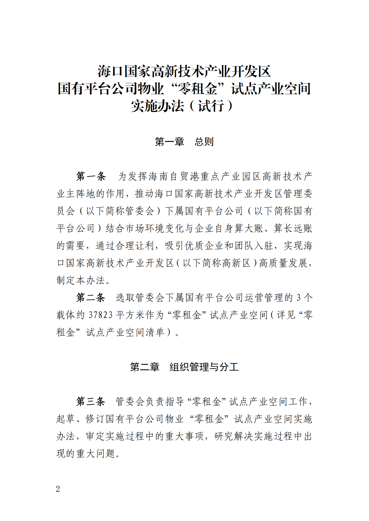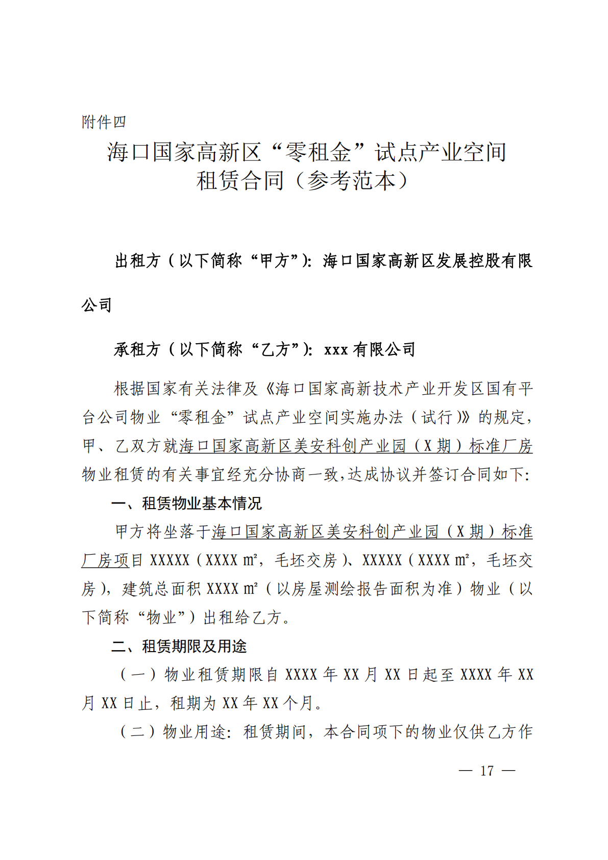 关于印发《海口国家高新技术产业开发区国有平台公司物业“零租金”试点产业空间实施办法》的通知